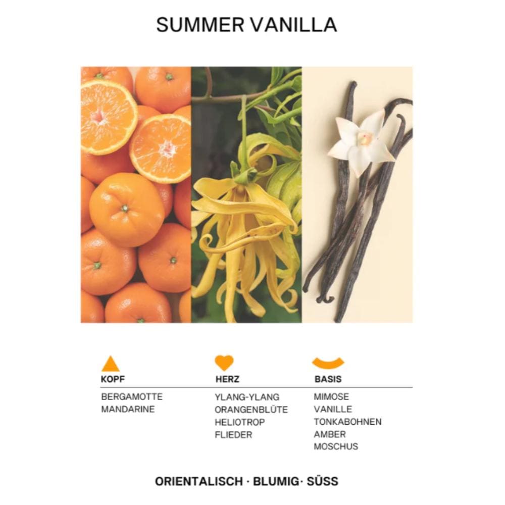 SUMMER VANILLA nu este doar un parfum, ci o stare. Aroma sa calda si florala iti ofera senzatia de vacanta, relaxare si bucurie, fiind parfumul ideal pentru momentele in care vrei sa te simti bine in pielea ta, fara efort.