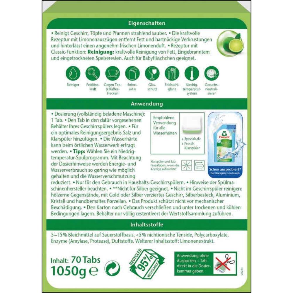 Capsule Frosch masina spalat vase 70buc. Curăță vasele, oalele și tigăile lasandu-le curate si strălucitoare; formula puternică cu extracte de lămâie îndepărtează grăsimea și depunerile persistente și lasă un parfum plăcut și proaspăt de lămâie; curățare puternica a alimentelor arse și a reziduurilor alimentare uscate. FOLOSIRE: Puneți tableta în compartimentul special al mașinii de spălat vase. Pentru rezultate optime de curățare, adăugați sare și agent de clătire.