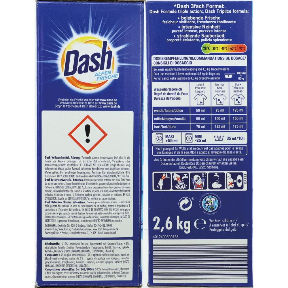 Pachetul contine 2,600 kilograme de detergent universal Dash Alpen Frishe, suficient pentru 40 de spalari!