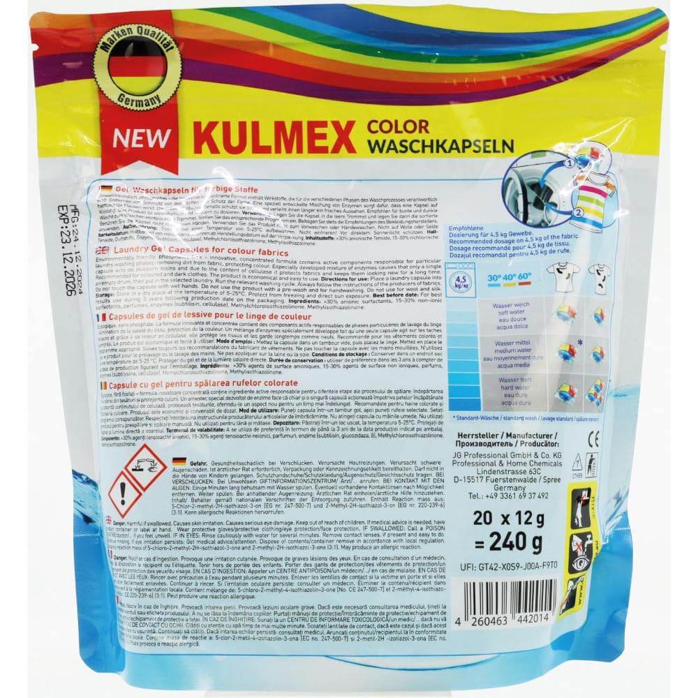 Capsulele Kulmex Color sunt capsule cu gel pentru spălarea rufelor colorate. Formula inovatoare concentrată conține ingrediente active responsabile pentru diverse etape ale procesului de spălare: îndepărtarea murdăriei din țesături și menținerea culorilor vii. Deutscher Markt