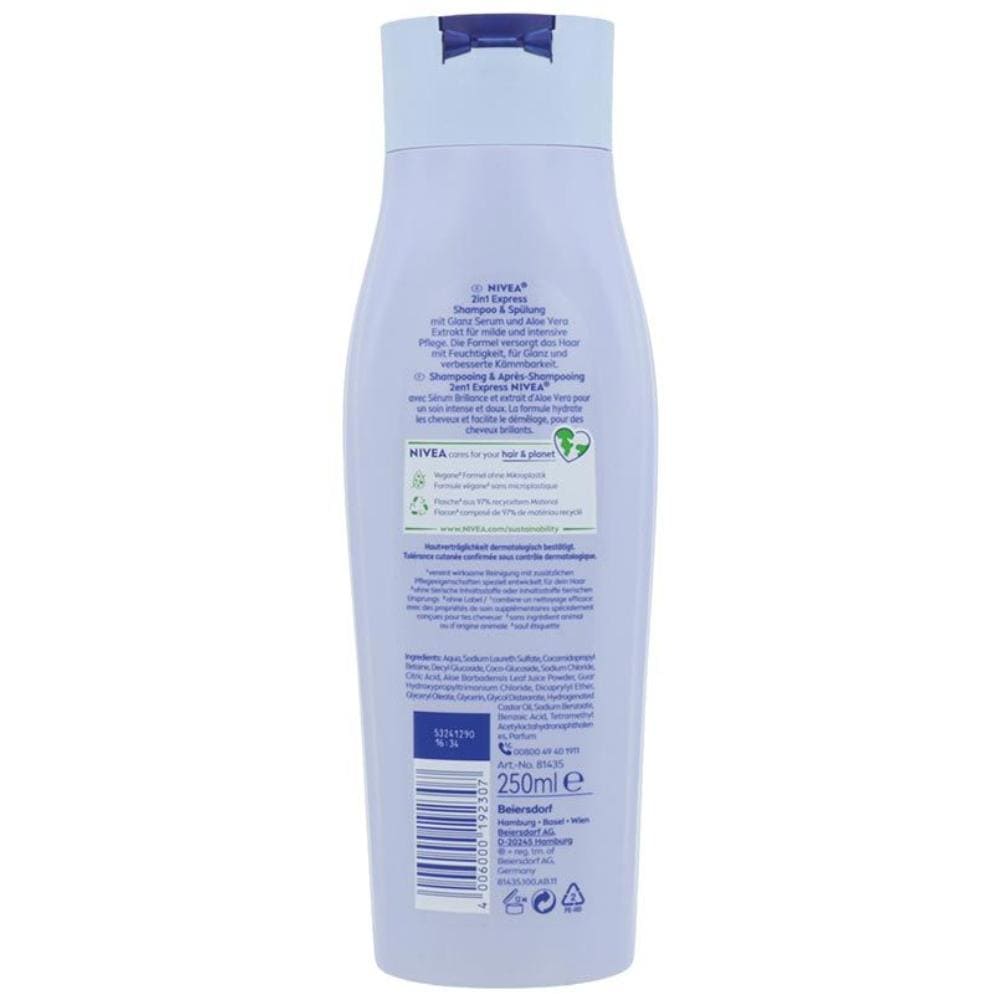 Sampon Nivea Women 2in1 Express 250ml. Șamponul și balsamul Express 2in1 cu combinația unică de ser de strălucire și extract natural de aloe vera oferă părului tău îngrijire intensivă în cel mai scurt timp posibil. Formula 2 în 1 combină serul de strălucire extrem de eficient și extractul natural de aloe vera pentru pieptănabilitate și suplețe îmbunătățite. Șamponul curăță delicat scalpul, protejează împotriva ruperii părului și întărește structura părului pentru mai multă rezistență, fără a-l îngreuna.