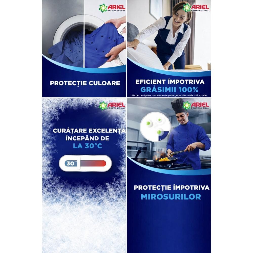 Formulat special pentru utilizare intensiva, detergentul Ariel Professional elimina eficient murdaria si petele dificile, inclusiv petele de grasime, fiind ideal atat pentru uz casnic, cat si pentru domenii profesionale precum restaurante, hoteluri, pensiuni sau servicii de curatenie.