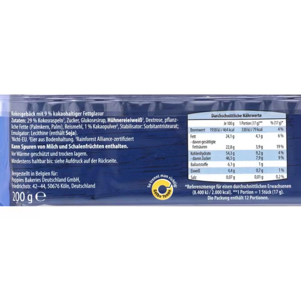 Ingrediente: 29% fulgi de cocos, zahar, sirop de glucoza, ou intreg, dextroza, uleiuri vegetale de palmier, faina de orez, 1% pudra de cacao, stabilizator: tristearat de sorbit. Ouale de pasare sunt crescute in aer liber; din afara UE.