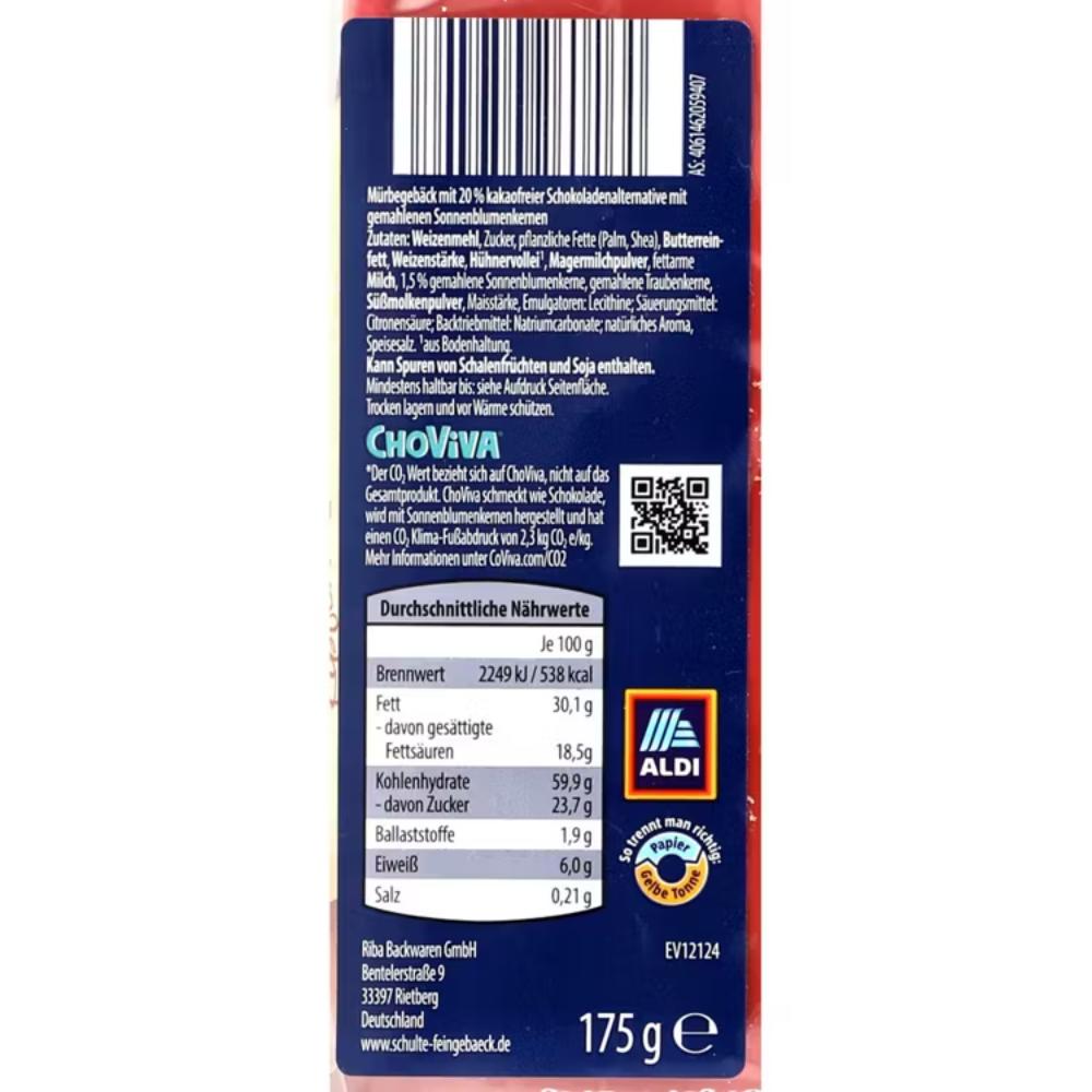 Ingrediente: faina de grau, zahar, grasime din palmier si shea, grasime din unt, amidon de grau, ou intreg, lapte praf degresat, lapte cu continut scazut de grasimi, 1,5% umplutura de seminte din floarea soarelui macinate, seminte de struguri macinate, pudra de zer, amidon de porumb, emulgator: lecitina soia, acid citric, agenti de crestere: carbonati de sodiu, aroma naturala, sare. Poate contine urme de fructe in coaja, lupin, susan si soia.